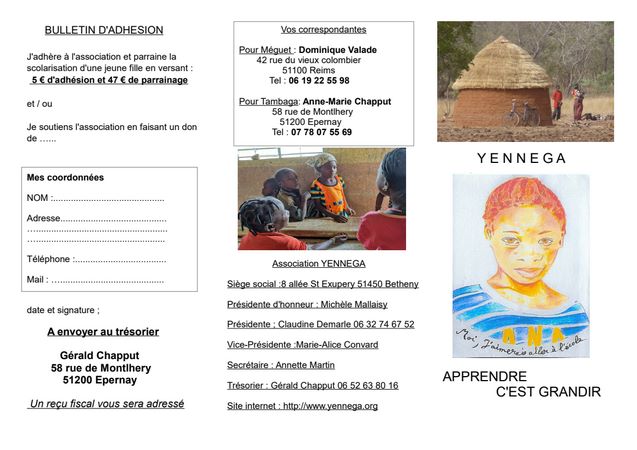 Vous pouvez envoyer votre contribution à l’Association Yennega, 8 allée St Exupéry 51450 Betheny.